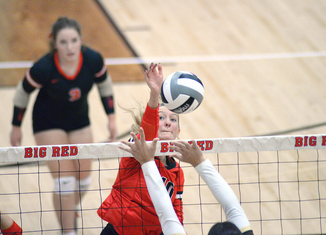 - Big Red’s Aubrey Slussar delivers a serve. – Andrew Grimm