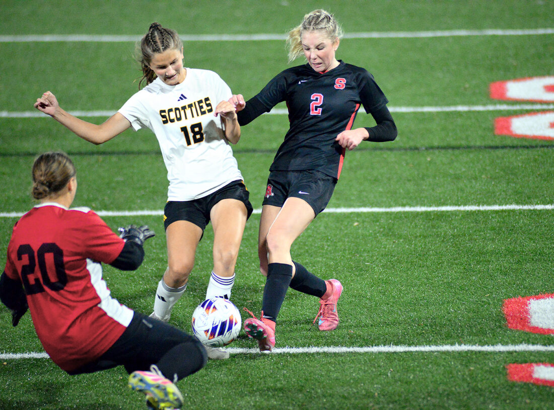 - Big Red’s Lucy Saccoccia and Tri-Valley’s Caydee Shoenleben pursue the ball while Scotties’ goalie Klara Drummonds looks make a stop during Monday’s district semifinal. – Andrew Grimm