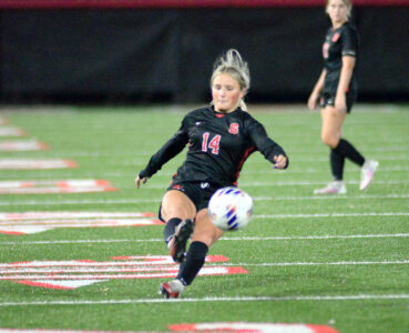 - Big Red’s Sagan Smarrella puts her leg into a free kick attempt towards the goal on Monday. – Andrew Grimm