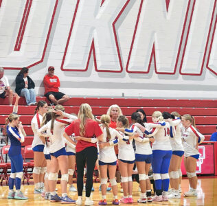 HUDDLED UP — The Toronto volleyball team huddles during a timeout during Monday’s tournament match. - Aaron Petchal