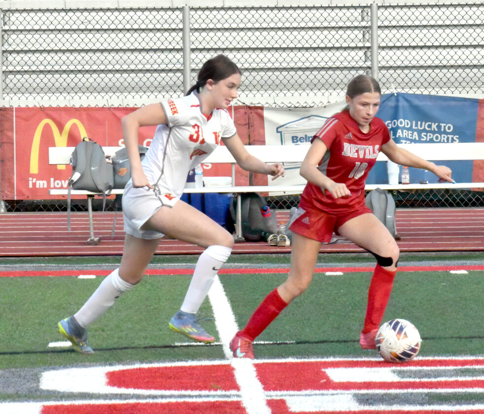 ON THE PITCH — Indian Creek’s Kaydence Walker and St. Clairsville’s Raegan Fillipovich pursue a loose ball during Monday night’s match with Indian Creek at Red Devil Stadium. The Red Devils rolled, 10-2. - Kim North