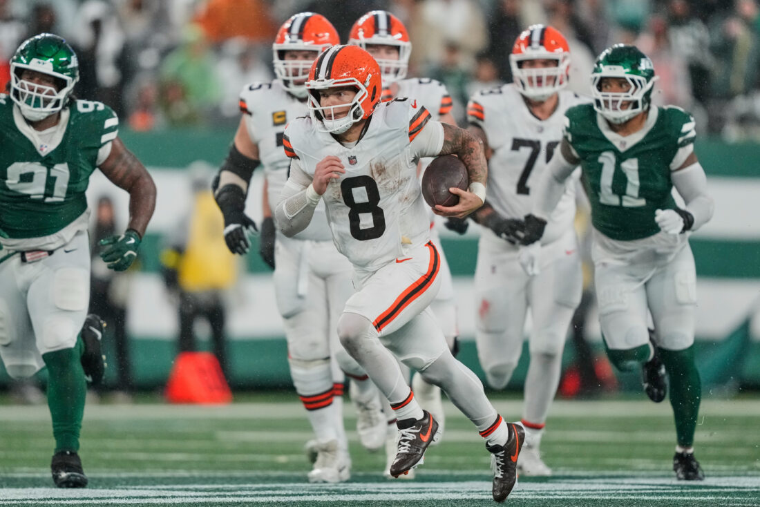 Cleveland Browns quarterback Dillon Gabriel (8) carries in the seance half of an NFL football game against the New York Jets, Sunday, Nov. 9, 2025, in East Rutherford, N.J. (AP Photo/Yuki Iwamura)