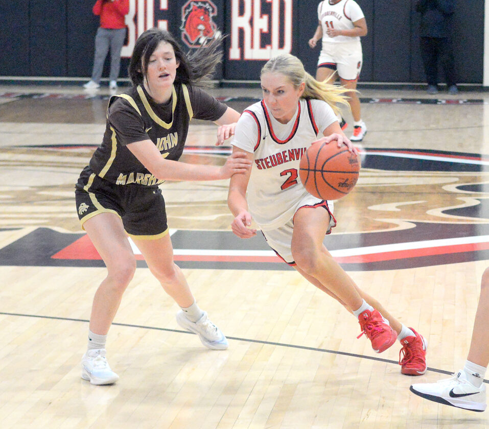 - ON THE MOVE — Big Red’s Lucy Saccoccia drives past John Marshall’s Kalyn Reese during the first half of Wednesday’s game inside the Crimson Center. Big Red rolled to a 67-40 win to improve to 7-0. – Andrew Grimm