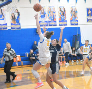 - Central’s Aurelia Hoover puts a layup past Madonna’s Adalynne Welch. – Andrew Grimm