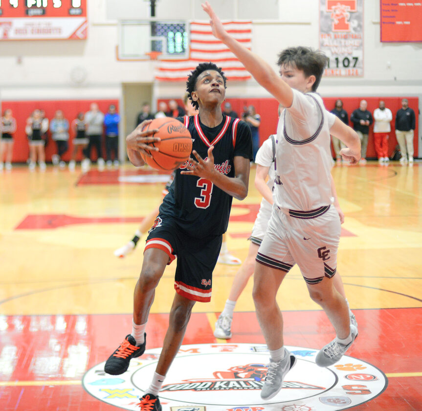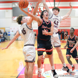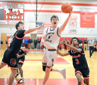 - Wheeling Central’s Eli Sancomb puts up a layup between Big Red’s Cole Bowers and Jermaine Moore during Saturday night’s game capping the first day of the Todd Kalivoda Holiday Showcase at Toronto High School. Sancomb had 50 points, 16 rebounds and six assists to lead the Maroon Knights to a hard-fought 82-72 victory over Steubenville. – Andrew Grimm