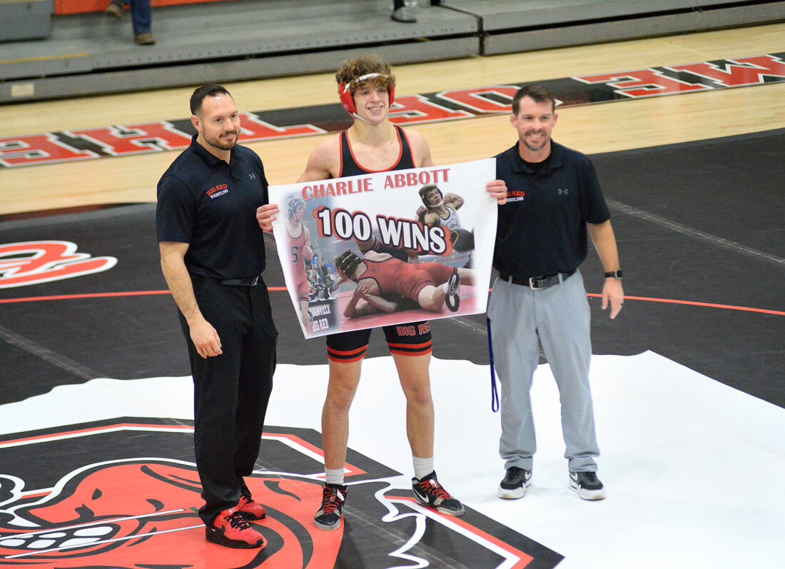 - MILESTONE REACHED — Big Red’s Charlie Abbott recorded his 100th career victory on Wednesday night, winning both of his matches by pin as Big Red rolled in a tri over Weir and Brooke. – Andrew Grimm