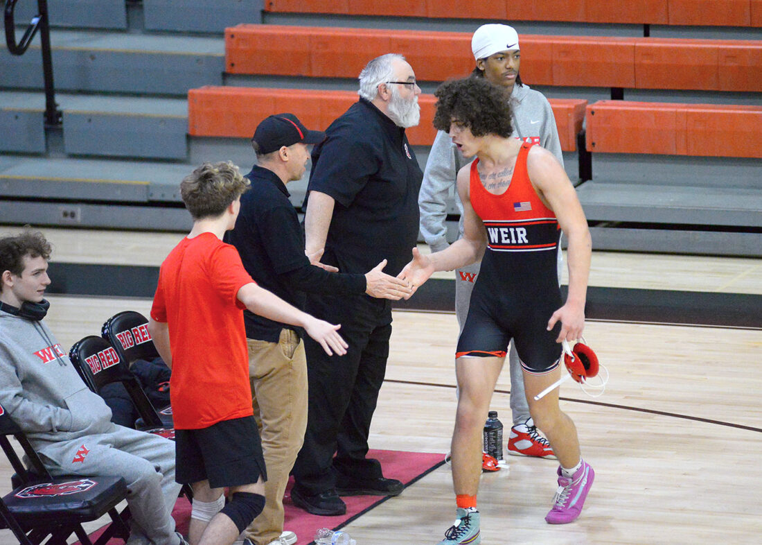 - Weir’s Benjamin Bryan is congratulated by teammates and coaches after he won a 215-pound match against Big Red. – Andrew Grimm