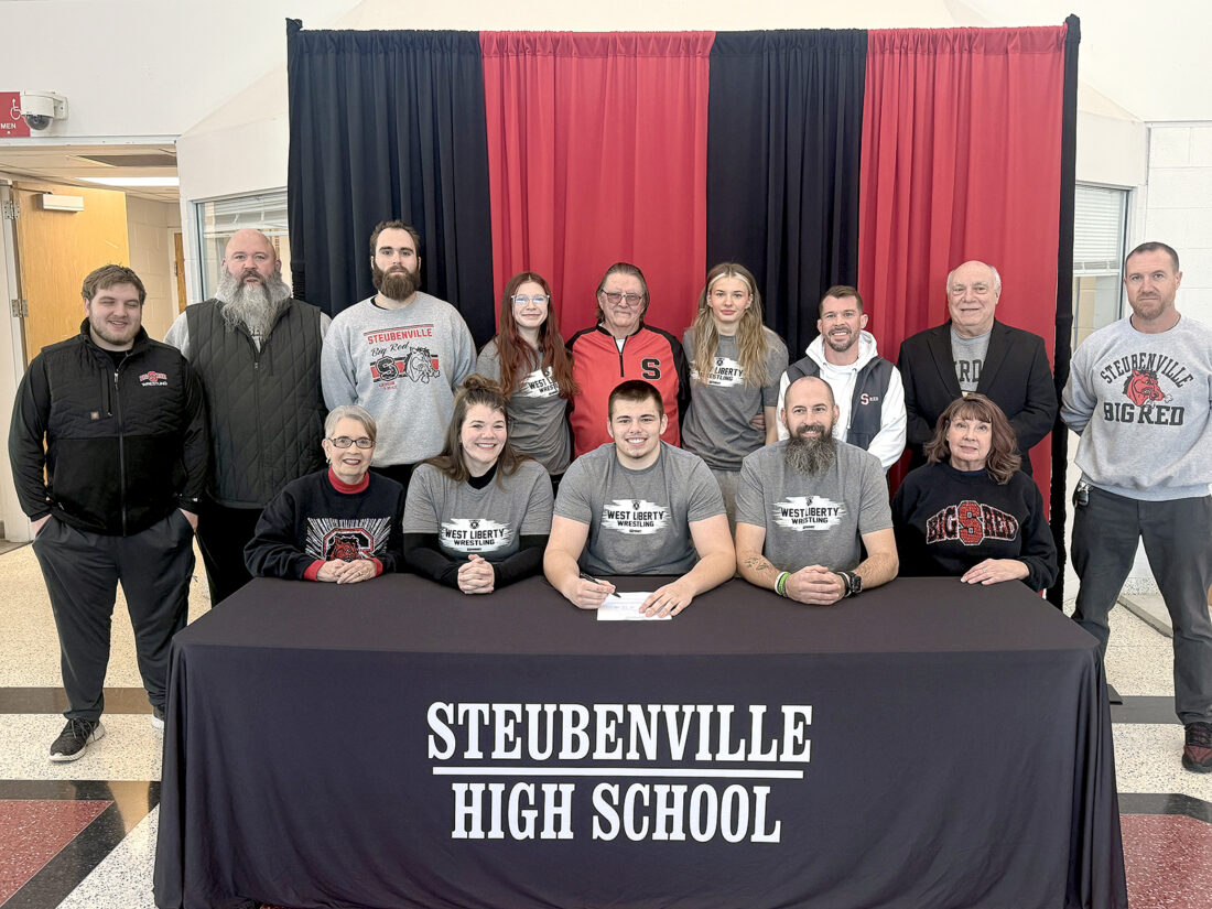 Big Red multi-sport athlete and standout heavyweight wrestler Beau Hudson signed his letter of intent to continue his academic and athletic careers at West Liberty University on Tuesday inside the Crimson Commons. Joining Beau, front, center, who is fresh off placing at last weekend’s OVAC tournament and also was an All-East District selection on the Big Red football team, were, front, from left, Lari French, his mother Melissa Hudson, father Jacob Hudson and Michelle Libetti; and back, from left, Keith Bodnar, Mike Blackburn, Alijah Demitrias, Cabella Hudson, Bill Croxall, Bri Hudson, Big Red head wrestling coach Lucas Huffman, Big Red head football coach Reno Saccoccia and JoJo Saccocia. – Contributed