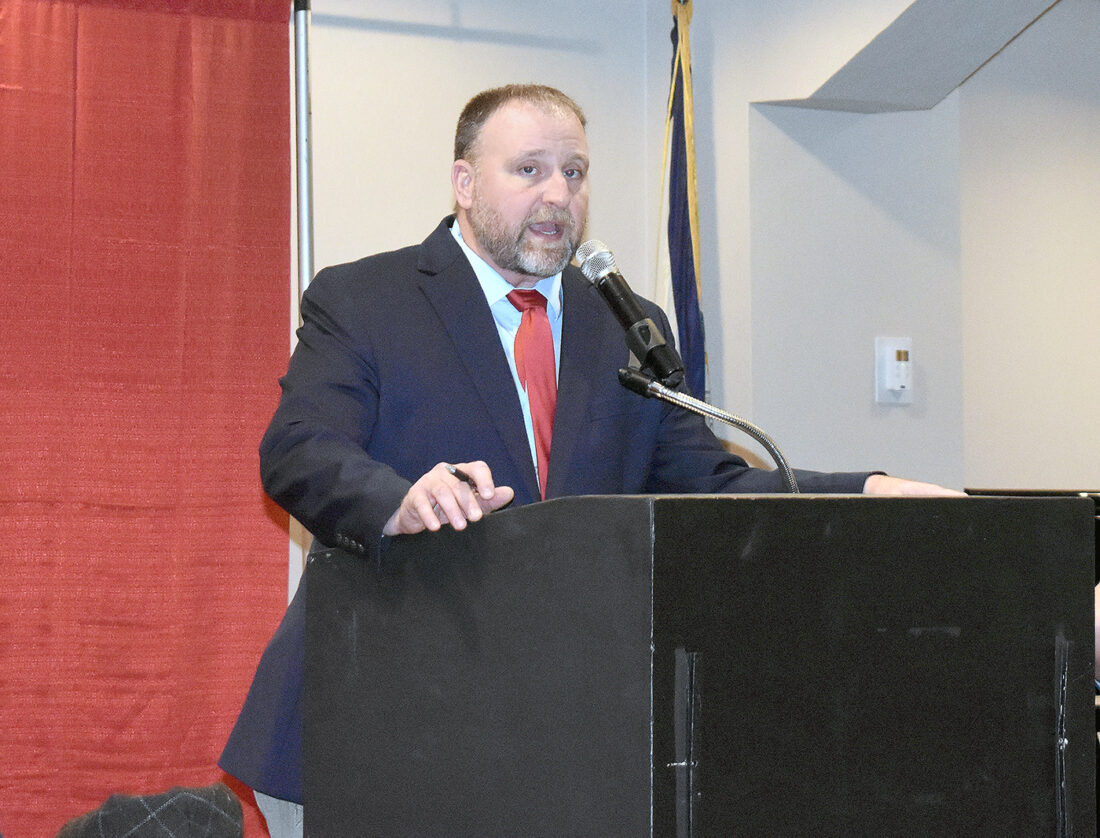 AT THE PODIUM — OVAC Ron Mauck Tournament Director Shane Shaffer talks to coaches during Monday night’s OVAC Ron Mauck Wrestling Championship press conference inside WesBanco Arena. The three-day event begins Thursday night. - Kim North