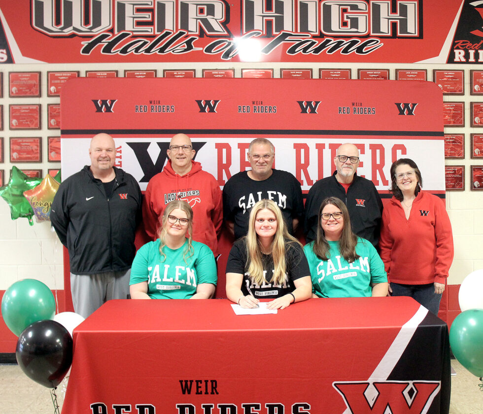 Weir High senior Eliza Utt signed her letter of intent to continue her academic and softball careers at Salem University. Weir’s ace that helped lead the Red Riders on a run to the state tournament last spring, she intends to major in sports management. Joining Eliza, front, center, for the occasion were, front, Jayme and Karla Utt and back, from left, Weir AD Dick Shilling, Jassistant coach Joe Aperfine, Chuck Utt, head softball coach John Leary and Kelly M. Lawton. – Contributed