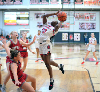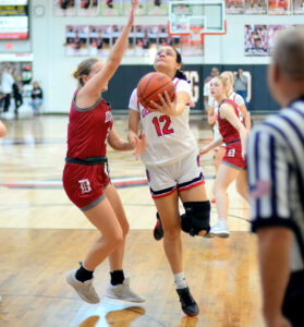 - Big Red’s Lucy Saccoccia takes the ball to the hoop on Saturday. – Andrew Grimm