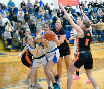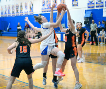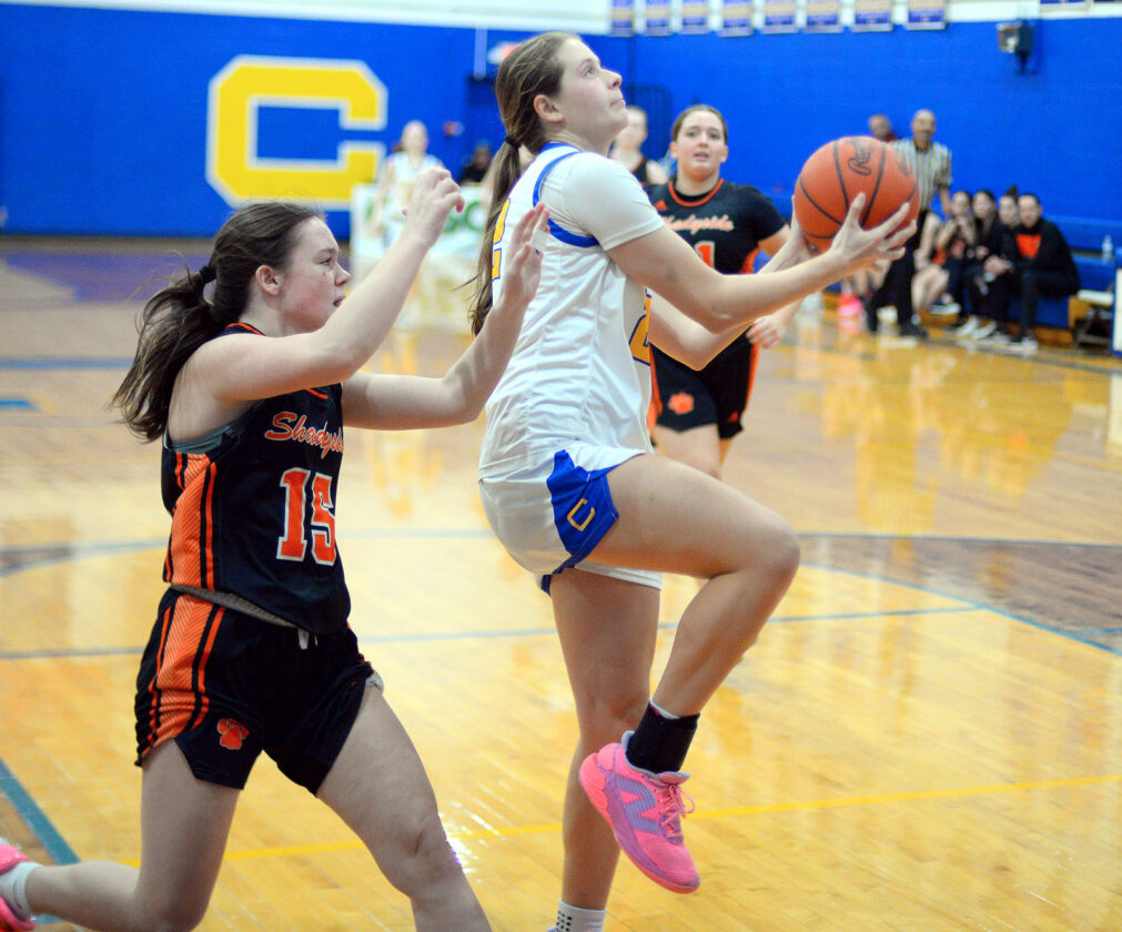 - LAYUP — Catholic Central’s Mary Rohde puts up a layup attempt past Shadyside’s Layla Samsa during Thursday’s OVAC Class 2A third place consolation game. – Andrew Grimm