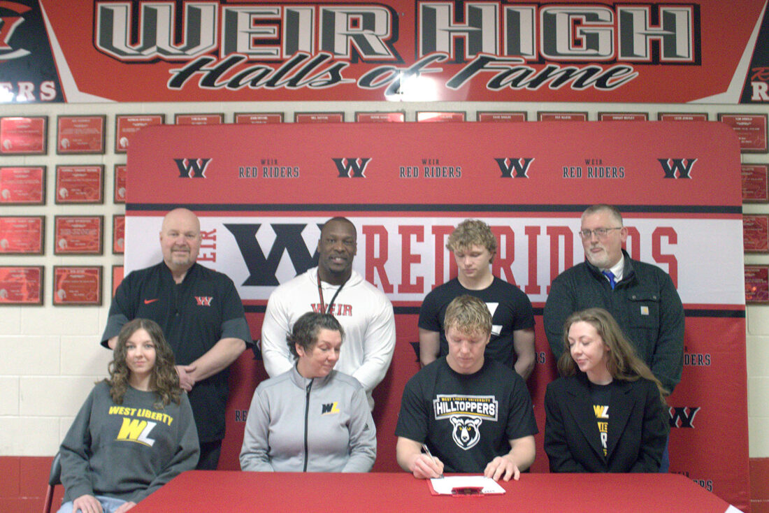 Weir High senior Daniel Howland signed to continue his academic and football careers at West Liberty University. Howland plans to major in business management while playing for the Hilltoppers. Joining Daniel, front, second from right, were, front, from left, Cecilia Howland, Danielle Howland and Angelina Howland; and back, Weir AD DIck Shilling, head football coach Quincy Wilson, Zack Howland and assistant coach Chris Hill. – Contributed