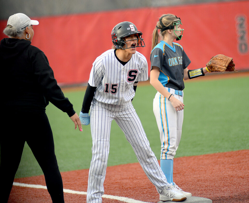- Photo by Andrew Grimm ANOTHER BIG HIT — Big Red senior Sadie Edwards celebrates after hitting an RBI triple against Oak Glen.