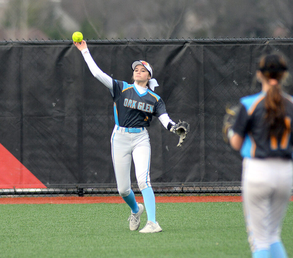 - Photo by Andrew Grimm FROM THE OUTFIELD — Oak Glen outfielder Mikalyn Balch fires the ball in after tracking in down in centerfield.