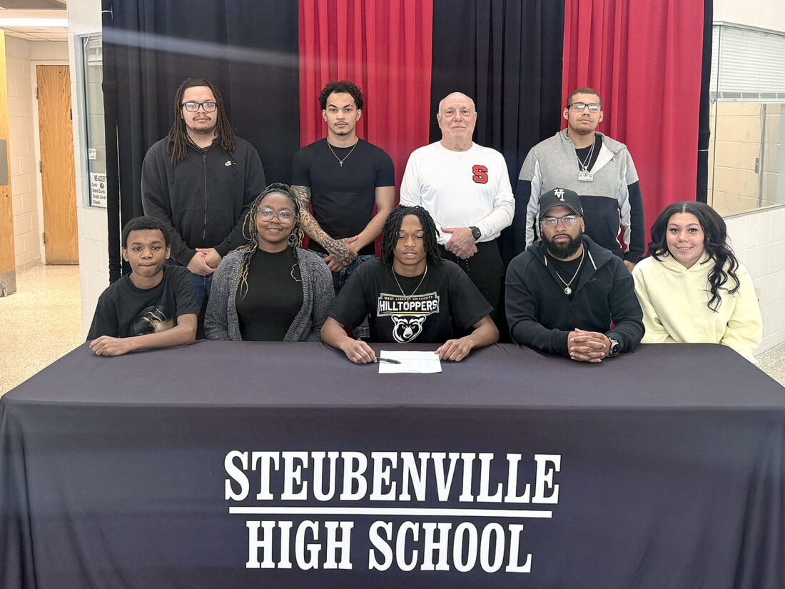 Steubenville Big Red senior Jermiah Hinton signed his letter of intent to continue his academic and football careers at West Liberty University. Hinton plans to major in business adminitration. Joining Jeremiah, front, center, for the occasion were, seated, from left, his brother S.J. Cassels, mother Courtnee Boyce, father Sean Cassels and girlfriend Arya Bigsby; and standing; uncle Dorian Thorne, cousin Jordan West, Big Red head coach Reno Saccoccia and uncle David Thorne. – Contributed