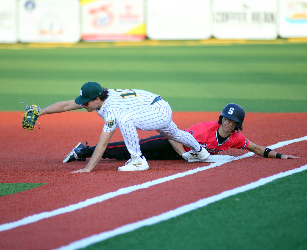 - Andrew Grimm DIVING BACK – Big Red’s Mason Chmierlorski dives safely back into first base head of a pickoff attempt from Brooke first baseman Baline Beatty.