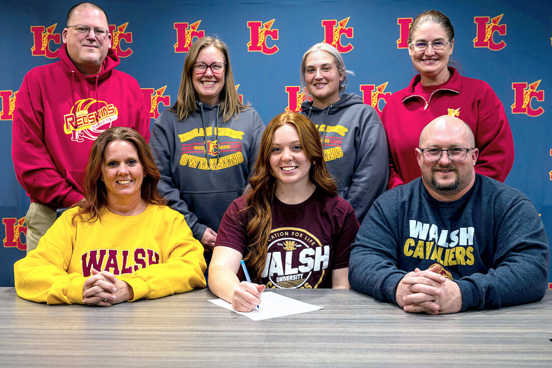 Indian Creek senior Gabby Boyuk recently signed her letter of intent to continue her academic and swimming careers at Walsh University. Joining Gabby, front, center, for the occasion were, seated, her parents Kerri Boyuk and Nick Dondzilla; and back, from left, ICHS athletic director Dave Kell, ICHS head swimming coach Sarah Houser, assistant coach Janna Olesky and assistant coach Amy Rusnak.