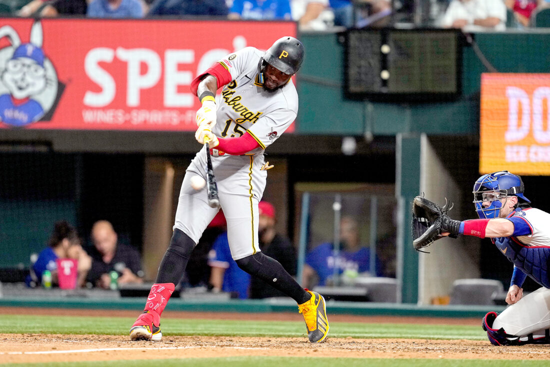 Associated Press ANOTHER HOMER — The Pirates' Oneil Cruz connects for a solo home run as Rangers catcher Kyle Higashioka looks on in the fifth inning of a game Thursday, in Arlington, Texas.