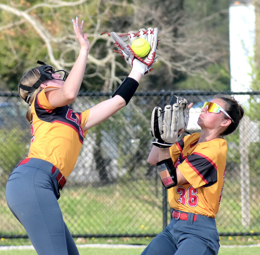 Ron Firth Indian Creek shortstop Kylie Dray and second baseman Olivia Hollenbeck converge on a popup at Beaver Local on Monday.