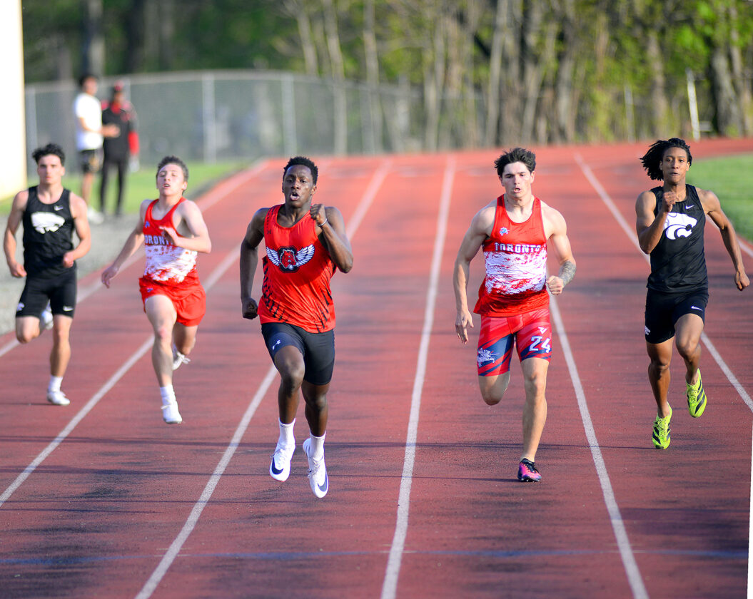 ON THE TRACK — Local runners, including Big Red’s Jojo Rea shown in the 200 sprint, competed in the Jefferson County Relays on Monday evening on the track at the Harding Stadium Complex. Athletes from Big Red, Catholic Central, Indian Creek, Toronto, Edison and Buckeye Local competed in the event. Full results were not yet available late Monday night.