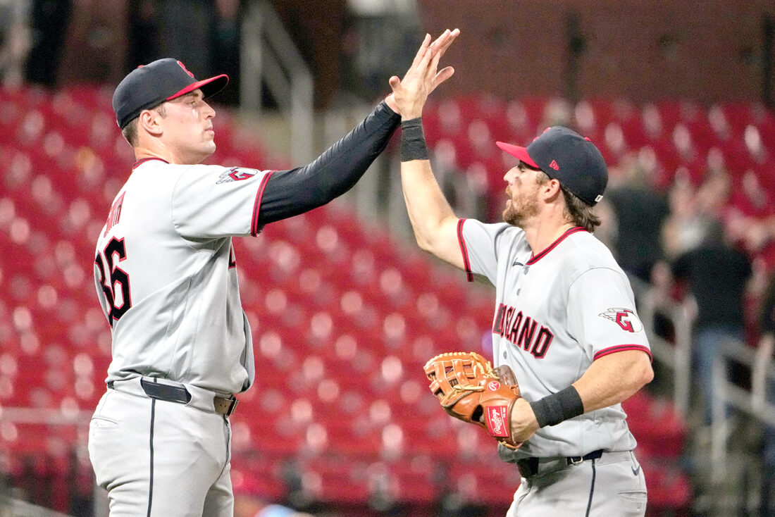 Associated Press Guardians pitcher Cade Smith and Daniel Schneemann celebrate a victory over the St. Louis Cardinals following a baseball game Monday in St. Louis.