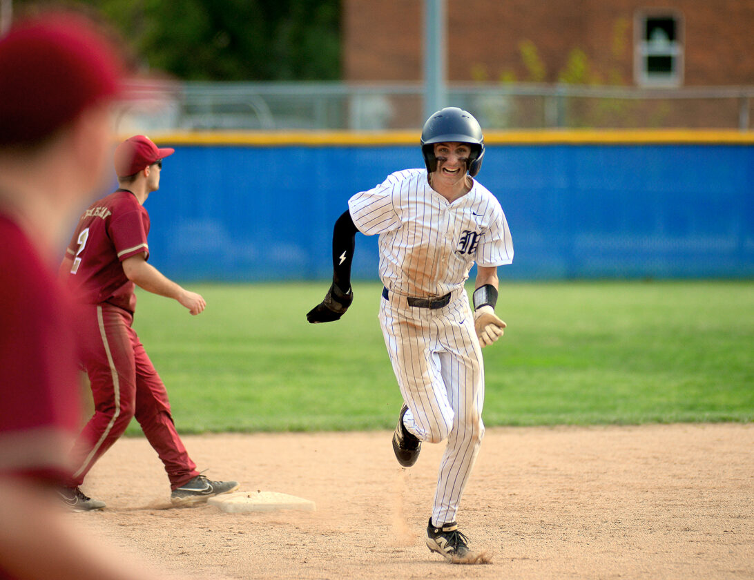 - Andrew Grimm RUNNING — Madonna’s Reno Fuscardo races to third base after one of his three hits against Trinity on Monday in the OVAC semifinals.