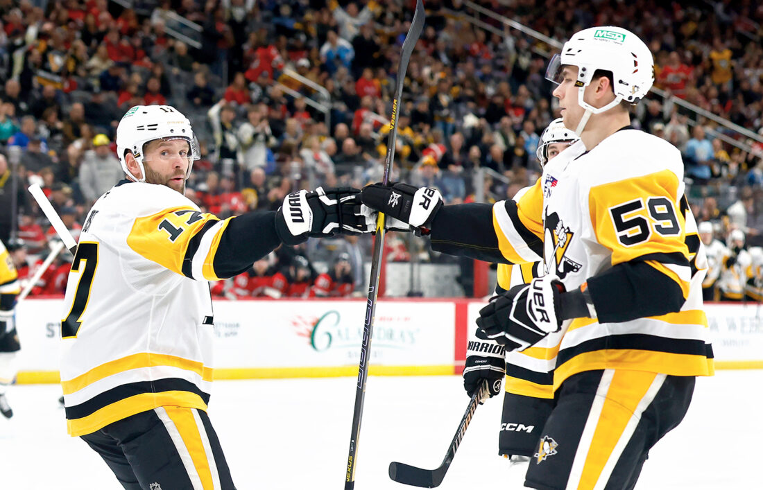 Associated Press Penguins right wing Bryan Rust celebrates with Egor Chinakhov after scoring a goal against the Devils during the first period of an NHL game, Thursday, in Newark, N.J.