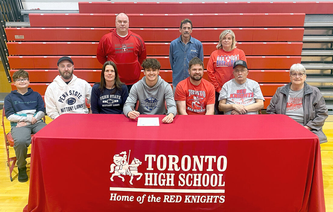 Toronto senior standout Austin Buchanan recently signed his letter of intent to continue his academic and basketball careers at Penn State Altoona. Buchanan was an All-District, All-OVAC and All-Ohio selection this season and helped the Red Knights win their first OVAC title in more than 30 years. Joining Austin, seated, center, for the occasion were, seated, from left, were his brother Aiden Buchanan, Jason Harzea, his mother Susan Buchanan, father Thomas Buchanan, Wes Deiley and Cheryl Deily; and back, from left, Toronto head basketball coach Sean Tucker, Jim Wilson and Angie Wilson.