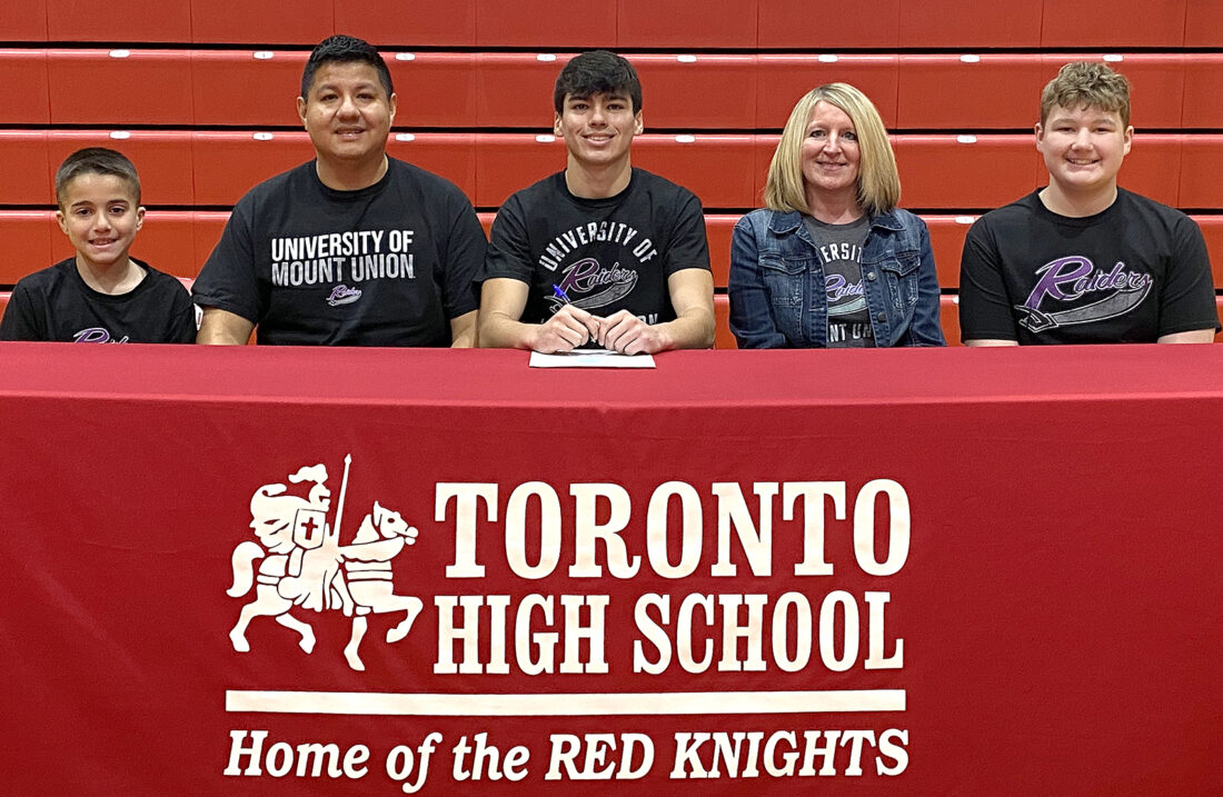 Toronto senior Landon Grimes recently signed his letter of intent to continue his academic and athletic careers at Mount Union University. Grimes, a multi-sport athlete for the Red Knights, will compete for the Purple Raiders’ track and field team. Joining Landon, center, for the occasion were, from left, his cousin Connor Lee-West, father Tommy Grimes, mother Jodie Grimes and cousin Andrew Gabathuler.