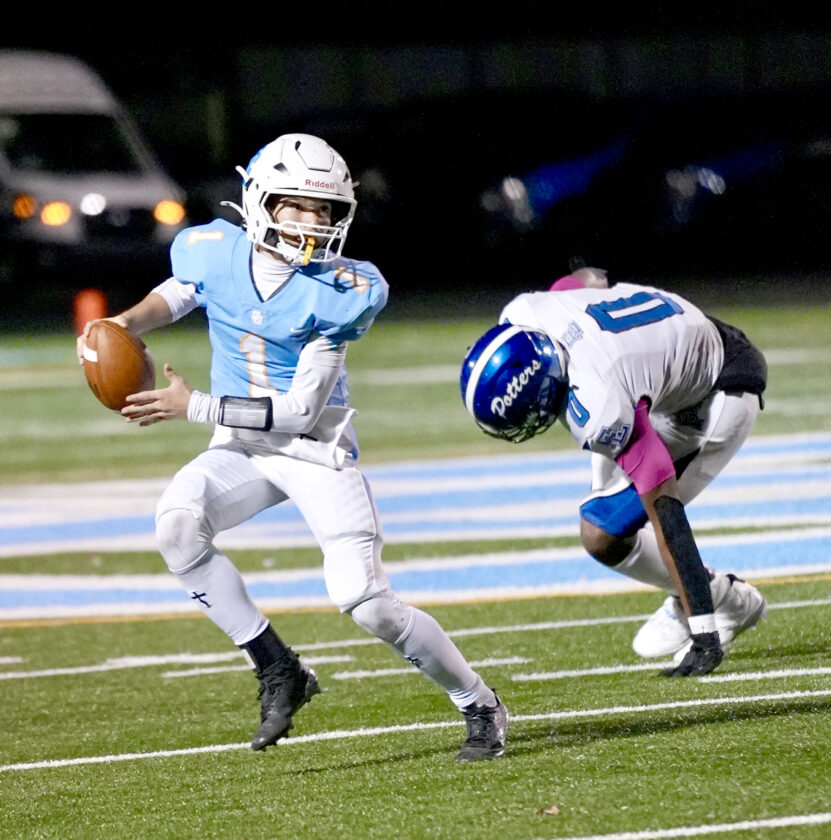 Oak Glen quarterback Maddox Bowen looks to throw while being chased by East Liverpool’s Dre’Keim Abercrombie. The Golden Bears won, 34-22, to improve to 7-2. (Photo by Jimmy Joe Savage)