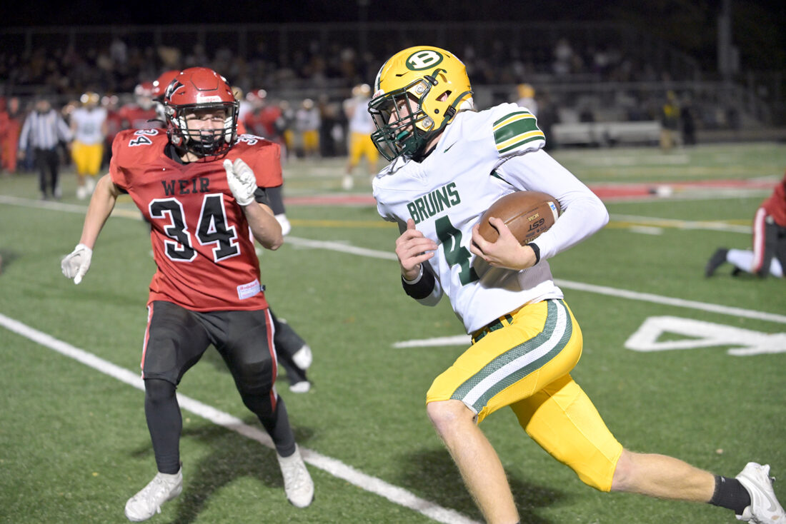 Brooke’s Grant Yost runs past Weir High’s Zackary Howland during Friday’s game at Jimmy Carey Stadium. The Bruins defeated the Red Riders 46-10 in the annual rivalry clash to close their season at 4-6. The Red Riders (0-9) have one more game left, a trip to Herbert Hoover next week. (Photo by Michael D. McElwain)