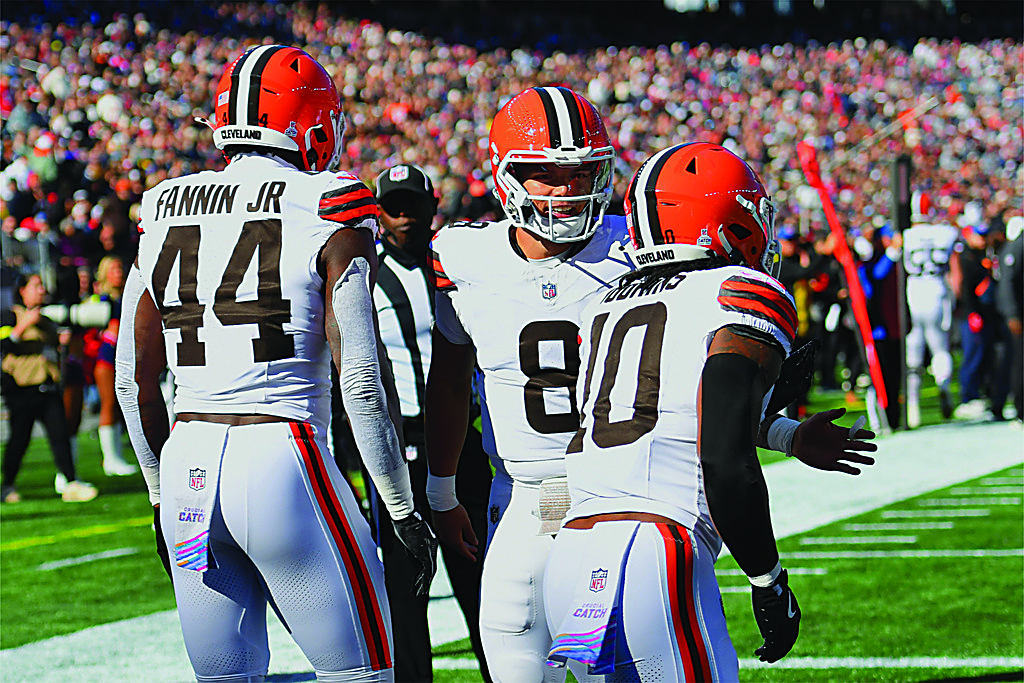 Cleveland Browns quarterback Dillon Gabriel (8) celebrates with tight end Harold Fannin Jr. (44) and running back Quinshon Judkins (10) after Fannin caught a touchdown pass against the New England Patriots in the first half of an NFL football game on Sunday, Oct. 26, 2025, in Foxborough, Mass. (AP Photo/Steven Senne)