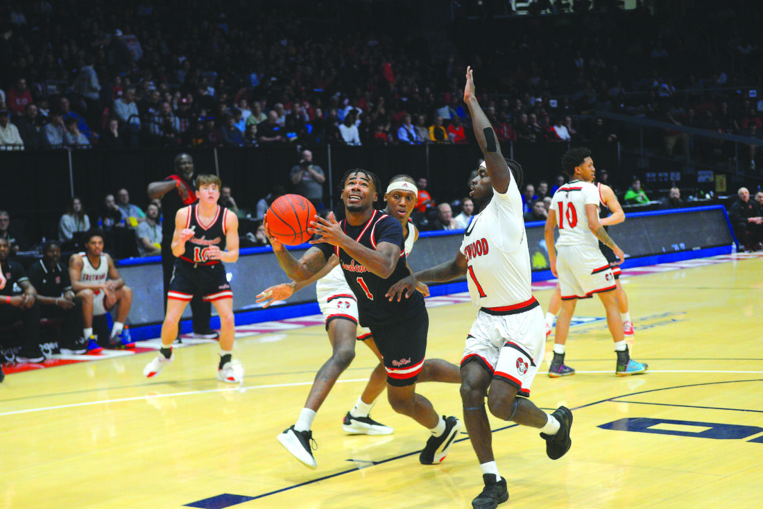 Andrew Grimm Big Red senior Tre’Von Wiggins attempts to get a shot up from mid-air during Friday night’s Division III state championship game inside UD Arena. Big Red fell, 48-47.