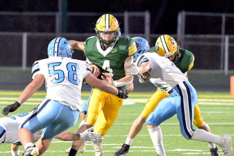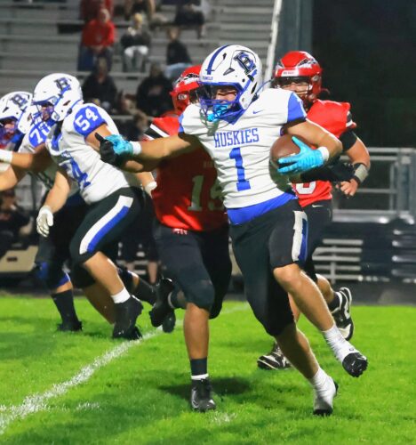 Brooke’s Grant Yost battles for yards during Friday’s game against Frankfort at Brooke Memorial Stadium. The Bruins fell, 66-13, to drop to 3-4 on the season. (Photo by Michael D. McElwain)